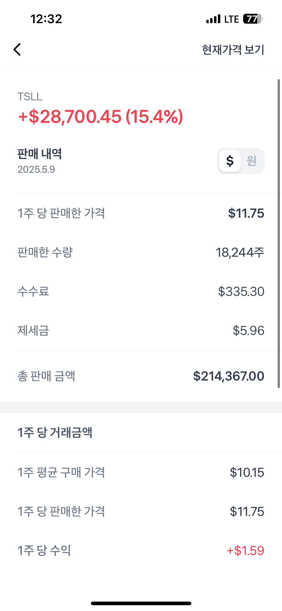 결과론적으론 TSLL으로는 $1.59 수익을 보았고 대략 2천700만원 가량의 수익을 얻었다.